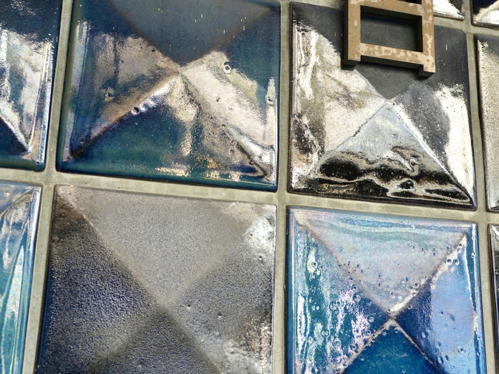 このタイルは、信楽焼から発想を得た「なまこ釉」を使用し、酸化焼成では鮮やかな青を、還元焼成では黒にも近い濃紺を表現しています。一部、灰色の窯変も見られます。また施釉後、釉薬が乾く少し前に手拭いで表面を擦ることで、マッドな質感の意匠を表現する工夫もされています。ひとつの釉薬で、青、灰色、濃紺、黒、さらに艶、艶消し、マッド質、様々な意匠を表現したのは、釉薬技術に関して泰山製陶所の影響を強く受けていたためです。