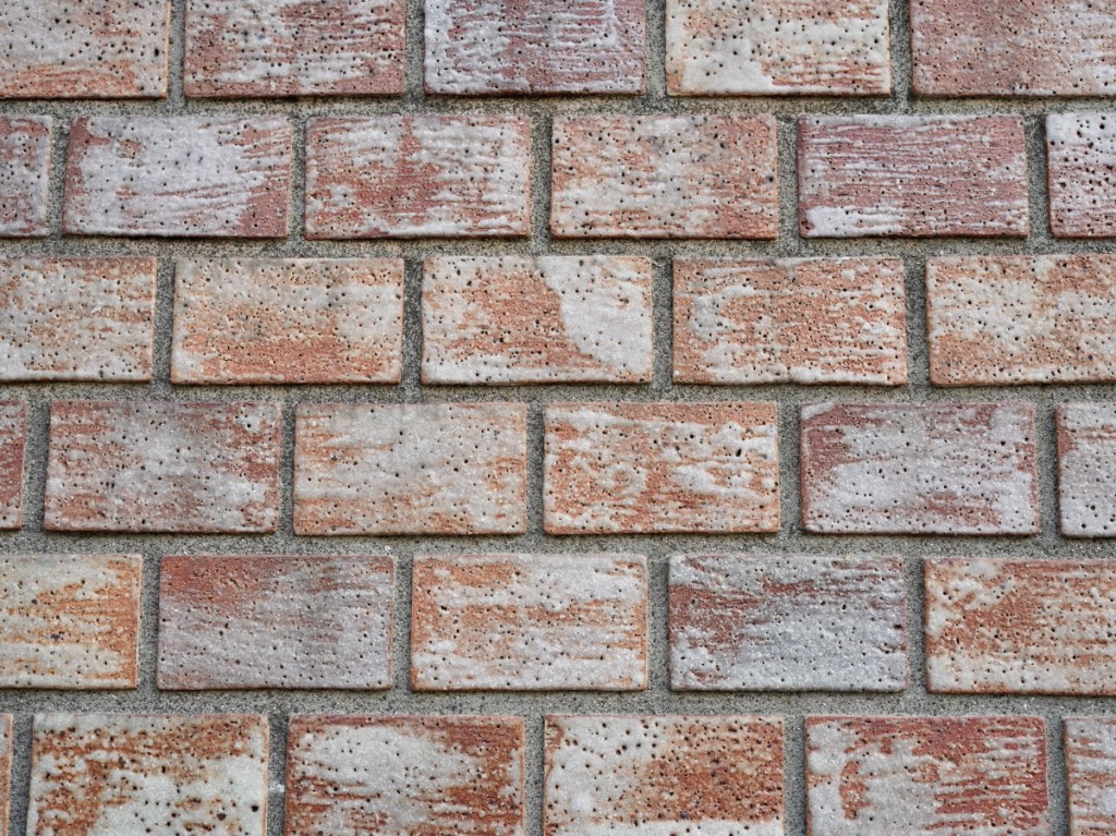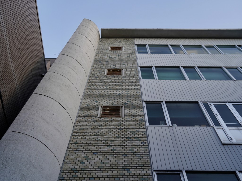 日酒販ビル隣りビルとの間壁には別のタイルが使用されています。こちらも大佛タイルの小口タイルです。こちらにも同じ「白窯変釉」が使用されています。釉薬の粘土を緩め、ハケで一回塗りされています。注目したい点は、釉薬が土に弾かれており「土を生かした表現」だということです。施釉、無釉、どちらかしかない量産タイルで、その中間の表現はとても斬新でした。尚、こちらのタイルは「手起こし」によるものです。