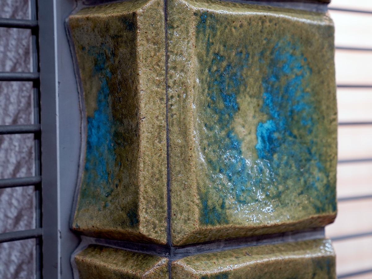 手起こしにより形成し焼成。釉薬が流れ落ちることを防ぐ為、製作過程で様々な試行錯誤がされたとのこと。中心部を凹ませることにより釉薬溜まりができ、結果的に釉薬による窯変が現れるようになりました。このスタイルは大佛美術タイルの最も有名な形のひとつです。釉薬は大佛組の施釉瓦にも使われる「緑釉」をベースに、トルコ青を相掛けすることにより三彩釉としています。ただし色の組み合わせが一般的な三彩釉の定義から外れる為、大佛組の資料には混合特殊三彩と記載されています。